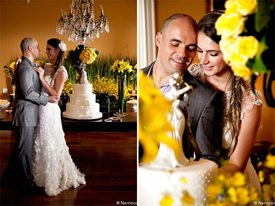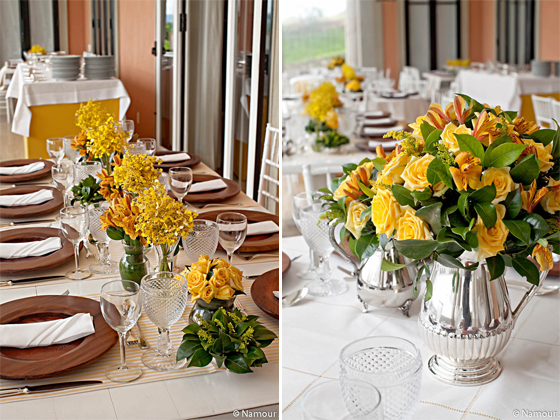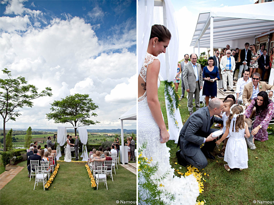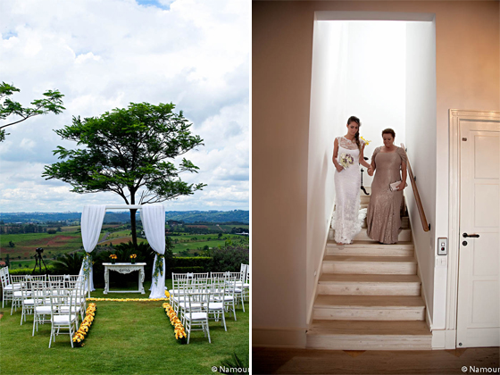 Foi na casa de campo dos noivos pertinho de Campinas que Karin e Jefferson escolheram como cenário para este casamento descontraído, alegre e elegante. Apenas convidados selecionados, um total de 150 pessoas, participaram desta festa montada ao ar livre nas varandas da casa, com vista para o vale e um lindo campo de golfe. Sorte da Karin ter fotos tão belas dela vestida de noiva, adorei! Decoração delicada amarela, a beleza da noiva, a cumplicidade dos noivos, o clima de descontração e amor, casamento lindo, dá vontade de entrar nas fotos e participar!