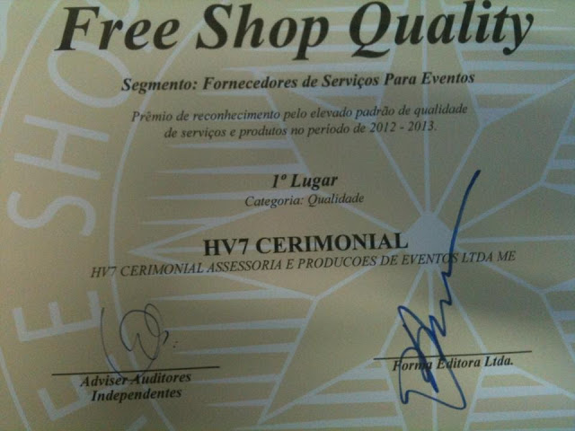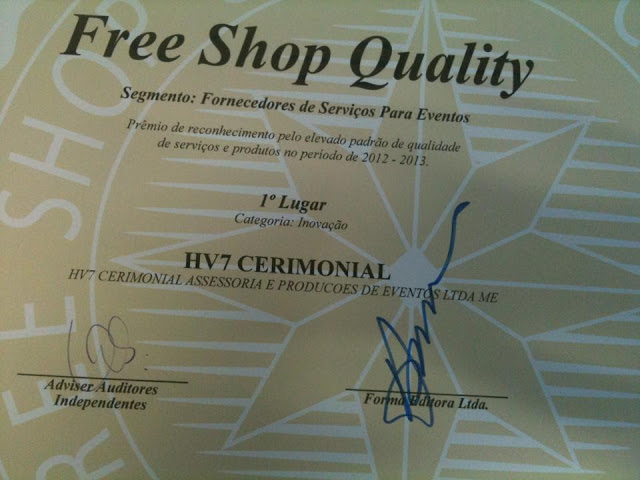 Forma Promocional – Empresa especializada em guias, sites e feiras de negócios business to business, dirigidos a um mailing de empresas pré-selecionadas, que abrange os principais segmentos de mercado em todo o país. Publica o Guia Free Shop Marketing Promocional desde 1984, lançando posteriormente os Guias Free Shop Preview e Free Shop Pocket. Além dos guias impressos e eletrônicos, a Forma Promocional já há alguns anos se dedica com sucesso à promoção e organização de feiras e seminários especiais. É promotora e organizadora da feira Brazil Promotion, maior evento de marketing promocional da América Latina, que ocorre anualmente no segundo semestre, em São Paulo. Também é responsável pelo Road Show, versão itinerante da Brazil Promotion, que abrange diferentes praças, com alto potencial na contratação de produtos e serviços promocionais.Muito obrigada a todos os amigos e parceiros que fizeram que a HV7 CERIMONIAL ASSESSORIA E PRODUÇÕES DE EVENTOS fosse a 1ª colocada em duas categorias Qualidade e Inovação.