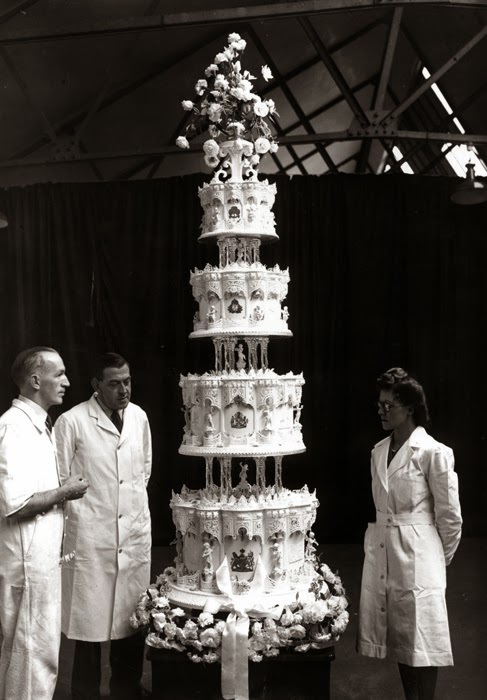 Príncipe Philip cortar o generoso bolo de quatro camadas – que atingiu 9 pés de altura – com a espada cerimonial, antes de ser dividido entre os 2.000 convidados. Uma camada de bolo de casamento foi mantido de lado para o batismo do príncipe Charles , um ano depois. A fatia que foi sob o martelo originalmente pertencia a um dos guardas dos recém-casados de honra em sua Westminster Abbey cerimônia de casamento.